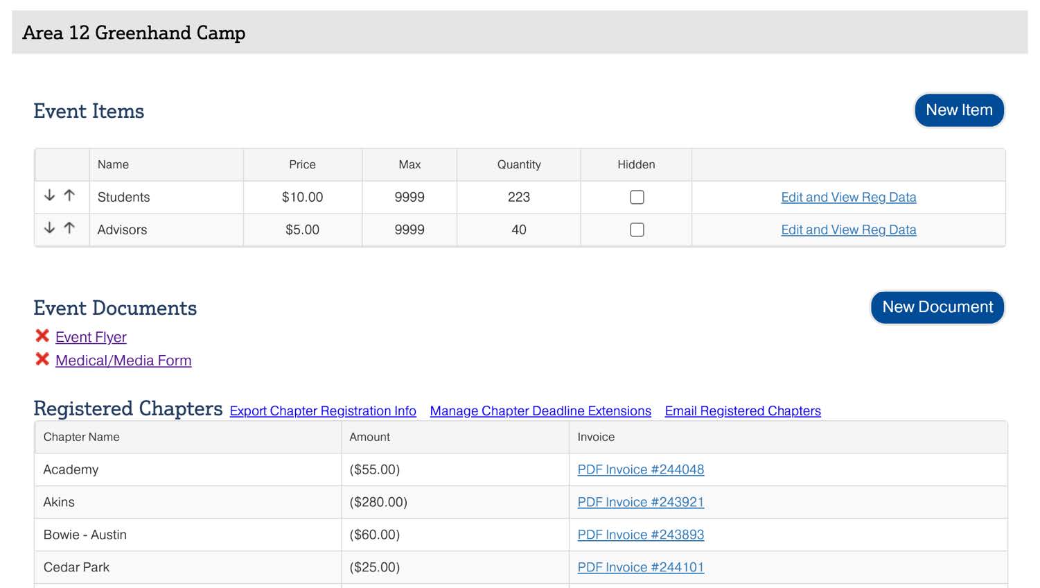 All chapters registered are shown to event admins with the ability to generate the PDF invoice