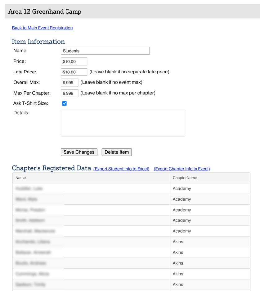 - Export Registered Student, Advisor and Team Member Names -- In each line item, you can generate a report all of student names, advisor names, or team member names registered for that particular line item. Information will include
