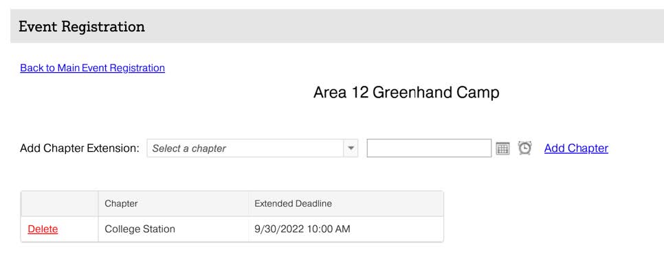 Individual chapters can be granted registration deadline extensions. These extensions override the overall event registration deadline and can be used if a chapter misses the overall deadline and the event admin wants to allow them to register or make changes to their registration without reopening the event for everyone. |