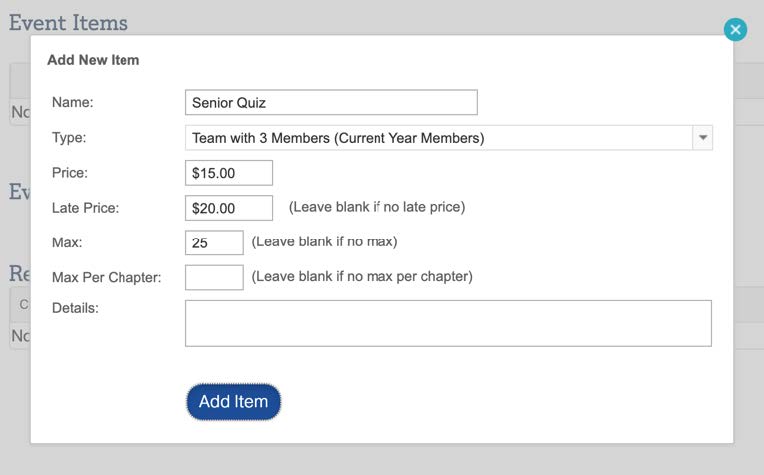 Events can be created with a variety of line-item types, depending type of registration data needed. Line items can be hidden from chapters when they are full, no longer available, or to allow setting up the line item by the event admin before making it available to chapters.