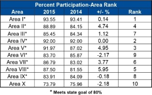 Eleven of the state’s 57 FFA districts, nearly one-fifth, reported that 100% of their chapters fielded at least one entry. Area I reported the highest rate of chapter participation with 93.55% of its chapters engaging in fall leadership competitions.