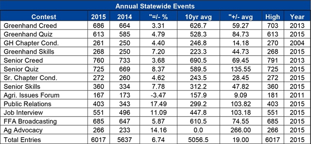 Six thousand and seventeen entries were fielded statewide, an all-time record. Nine of 13 events recorded all-time high marks: Greenhand FFA Quiz, Greenhand Agricultural Skills Demonstration, Senior Agricultural Quiz, Senior Agricultural Skills Demonstration, Senior Chapter Conducting, Job Interview, FFA Broadcasting, Public Relations and Agricultural Advocacy all hit all-time record participation.