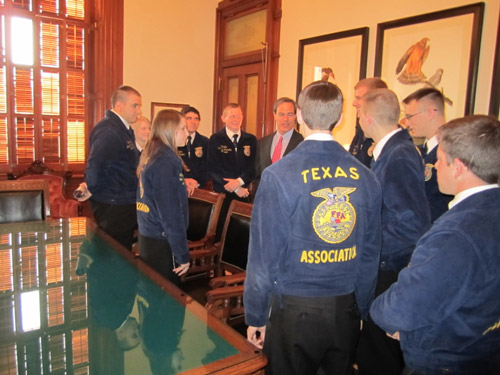 Later on that day, the state officers arrived at the Texas State Capitol to have a brief meeting with Lt. Governor David Dewhurst. Governor Dewhurst has held this position since 2003 and has had a large impact on Texas’ government. With education being one of Governor Dewhurst’s passions, he was glad to meet with the state officers and see the excellent leadership FFA develops in students.