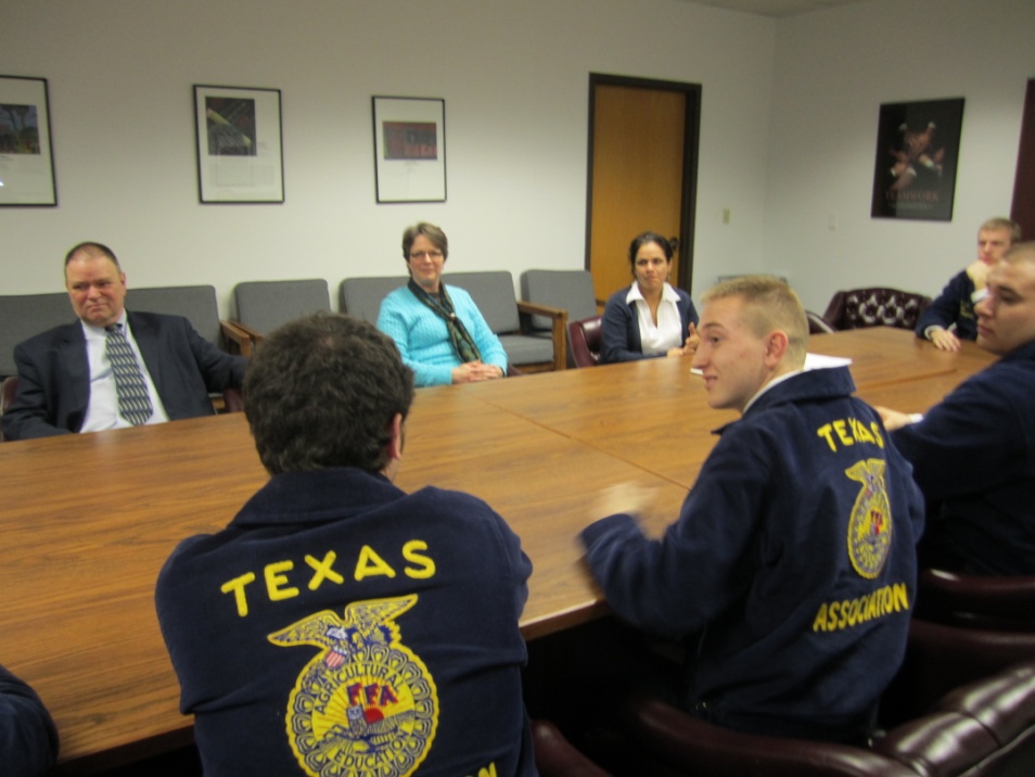 The state officers’ first meeting in Austin was with the Texas Commissioner of Agriculture, Todd Staples. Upon arrival, the state officers were welcomed into Commissioner Staples’ office, one with a gorgeous view of the capitol. One of the main topics during the visit was that of the future of agriculture in Texas. According to Commissioner Staples, the main issue currently facing Texas, and one that will continue to trouble our state in the future, is the issue of our water supply. With water being one of our most valuable resources, it is important this issue be on everyone’s mind. As young agriculturists, the state officers were all very grateful for this experience and for all that Commissioner Staples has done for our state. He provided the team with great insight.